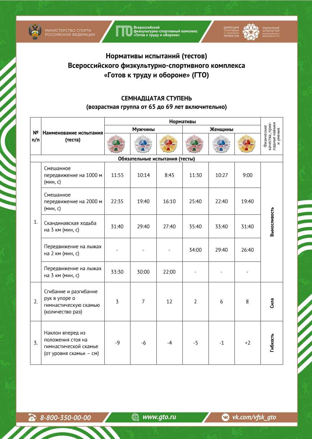 Для 17 ступени ГТО, которая предназначена для взрослых 65-69лет, необходимо выполнить несколько обязательных испытаний и испытаний по выбору. Среди обязательных испытаний: